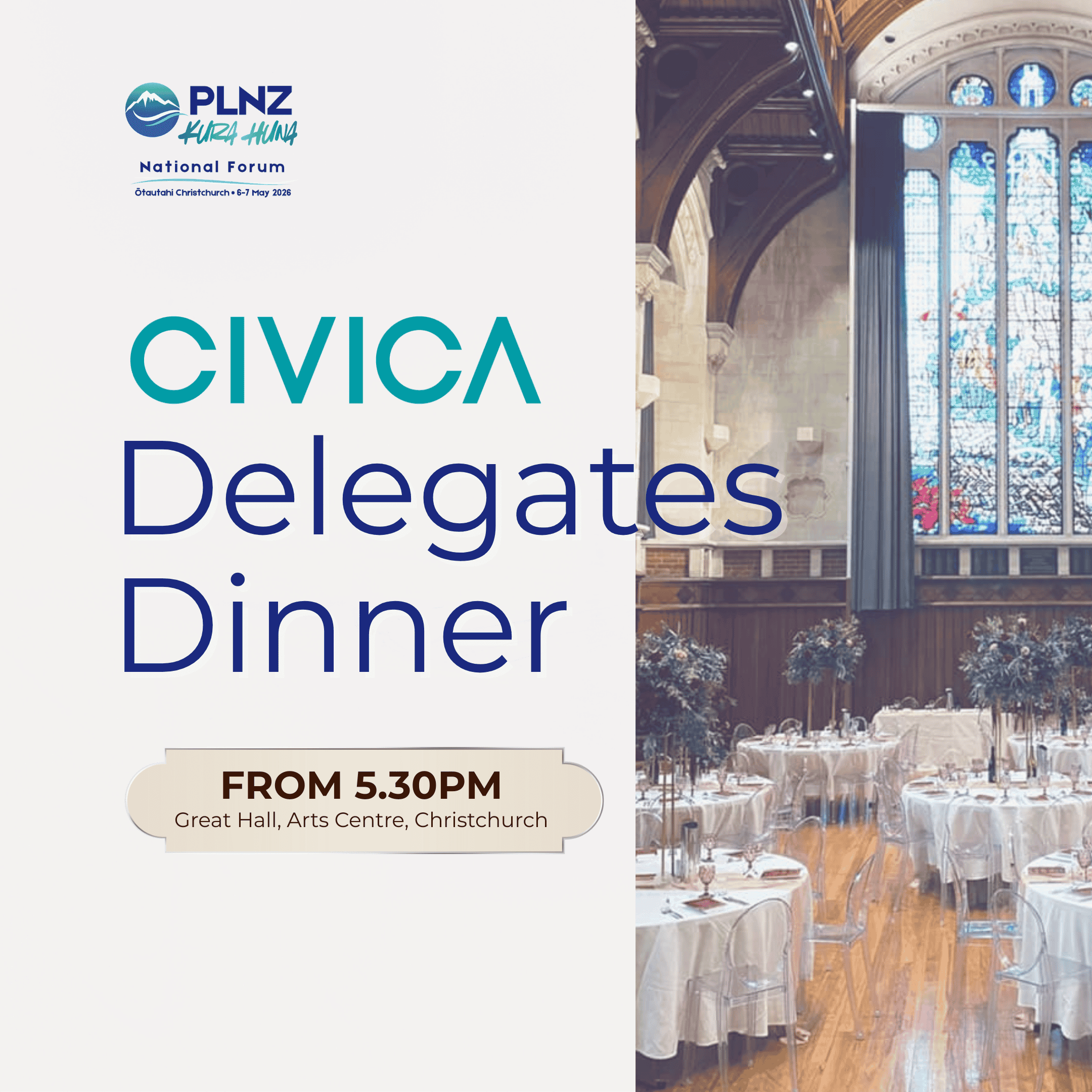 After a our first full day on Wednesday 6 May of speakers and discussions, PLNZ invites you to the Civica Gala dinner, details below.